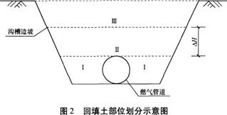 网络计划图中的E1、E2工作为土方回填和敷设警示带,管道沟槽回填土的部位划分为Ⅰ、Ⅱ、Ⅲ区,如图2所示: