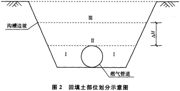 网络计划图中的E1、E2工作为土方回填和敷设警示带,管道沟槽回填土的部位划分为I、Ⅱ、Ⅲ区,如图2所示: