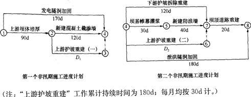 (3)从第-个月起,按进度款的5%扣留工程质量保证金。 当地汛期为7~9月份,根据批准的施工总体进度计划安排,所有项目均安排在非汛期施工。其中“上游坝体培厚”、“发电隧洞加固”、“新建混凝土截渗墙”安排在第-个非汛期完成,为满足防汛要求,“上游护坡重建”在第-个非汛期安排完成总工程量的80%,剩余部分工程量安排在第二个非汛期施工,其余项目均安排在第二个非汛期施工。 承包人编制的施工网络进度计划如下图,其中第二个非汛期计划在2011年10月1日开工。该计划上报并得到批准。