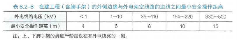 【备考点拨】本小题主要考查脚手架和斜道的搭设要求。《水利水电工程施工通用安全技术规程》第4.1.5条规定,在建工程(含脚手架)的外侧边缘与外电架空线路的边线之间应保持安全操作距离。最小安全操作距离应不小于下表的规定。
