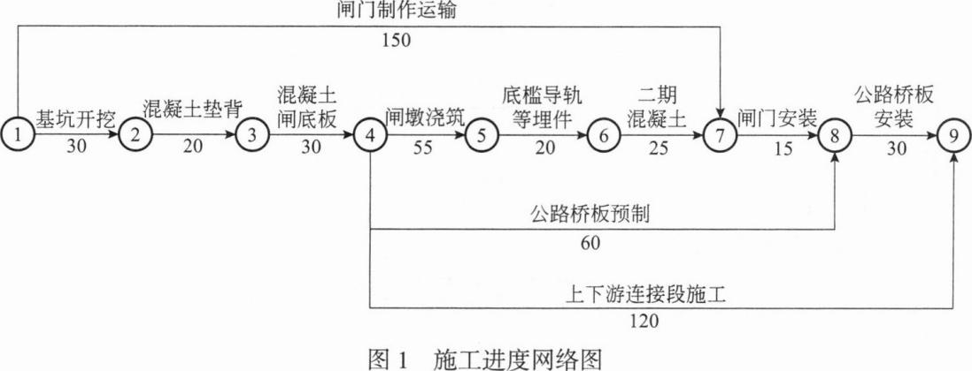 某水闸项目经监理单位批准的施工进度网络图如图1所示(单位:d),合同约定:工期提前奖励标准为10000元/d,逾期违约金标准为10000元/d。