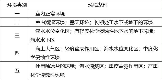 | 五 | 使用除冰盐的环境;海水浪溅区;重度盐雾作用区;严重化学侵蚀性环境 |