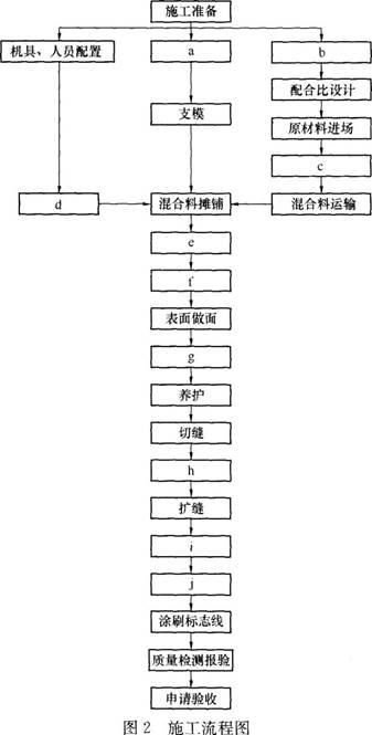 1.施工流程中a~j工序所代表内容:a为模板制作;b为原材料检验;c为混合料拌合;d为人员机具到位;e为混合料振捣;f为混合料整平、提浆、找平;g为表面拉毛;h为拆模;i为清缝、灌缝;J为清扫道面。