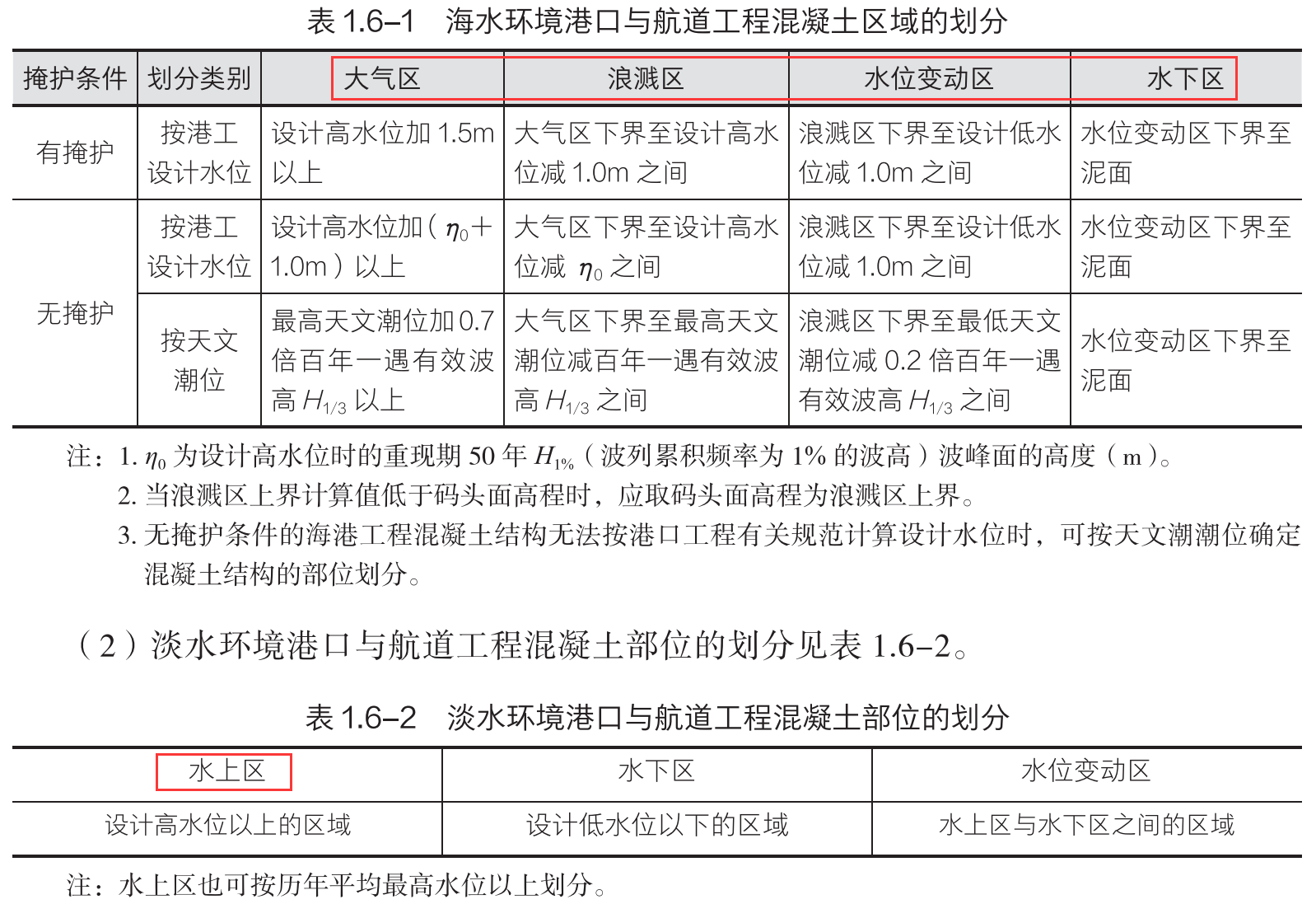 港口与航道工程混凝土建筑物按不同的环境类别以及标高划分为不同的区域,不同区域的混凝土技术条件、耐久性指标、混凝土的钢筋保护层厚度等均有不同的规定。
