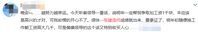 从以上网友的发言我们不难看出,一建人都是自己自主自发的进行考证,并没有逼迫式的考证,因为成年人的世界很残酷,在建筑行业没有一证傍身,发展简直是难上加难。在建筑工程项目中,没有一建证书就无法真正的成为一个项目的经理。只能在项目中做施工,做调度,做材料管理,做工程技术等等,无法突出自己。
