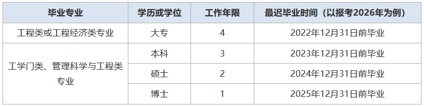 1.取得工程类或工程经济类专业大学专科学历,从事建设工程项目施工管理工作满4年;