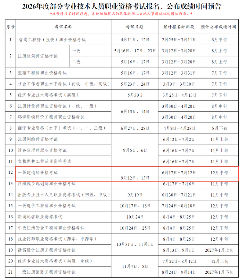 中国人事考试网正式发布《2026年度专业技术人员职业资格考试重要提示》,确定了2026年一级建造师考试报名时间预计为6月17日-7月12日。在预计报名入口开放时间范围内,各地组织报名的具体时间安排以当地人事考试机构通知为准。