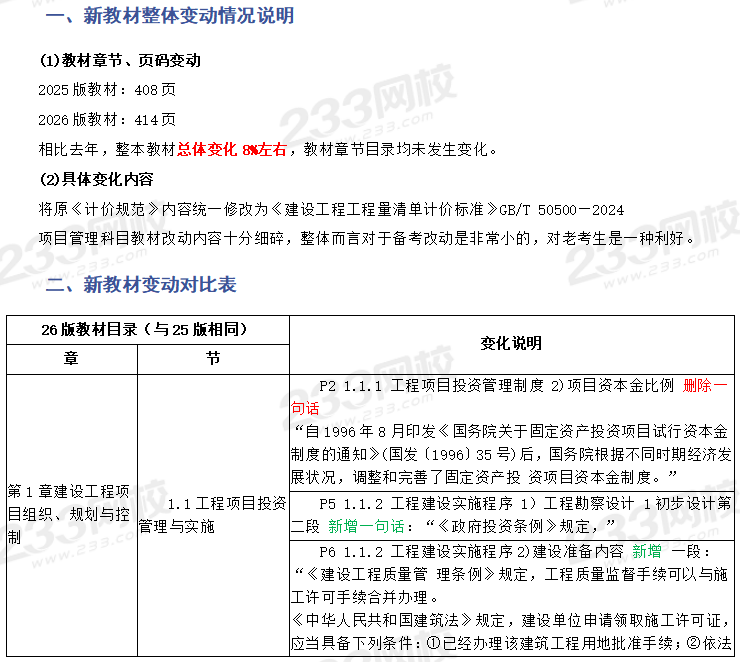 2026年一级建造师《项目管理》考试教材已于1月6日出版发行,相信众多考生都在翘首以盼,心里琢磨着:跟旧教材相比,新教材变化究竟大不大?到底有哪些关键变动呢?233网校第一时间梳理新旧教材详细对比,帮助大家把握考纲动向!