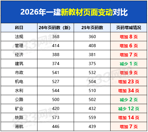 对比往年,除个别科目外,各科教材页数总体保持稳定,变动基本控制在合理范围内。值得注意的是,机电、水利、铁路等科目内容均有补充,反映了行业政策与规范的最新要求,备考覆盖面需同步更新。具体页数变化见下表 :