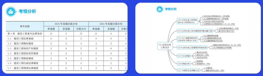 · 考情分析:公共科用历年真题考点分布图“划重点”,实务课以知识框架梳理章节脉络,备考方向一目了然。
