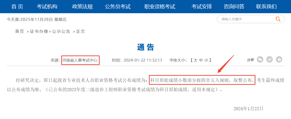根据河南省人事考试网发布的通知,自2024年起,专业技术人员职业资格考试(含一建、二建等)成绩公布规则正式调整:科目原始成绩的小数部分按四舍五入规则取整,最终成绩以整数形式呈现。这一政策并非“新规”,而是对长期执行的评分惯例的官方背书。