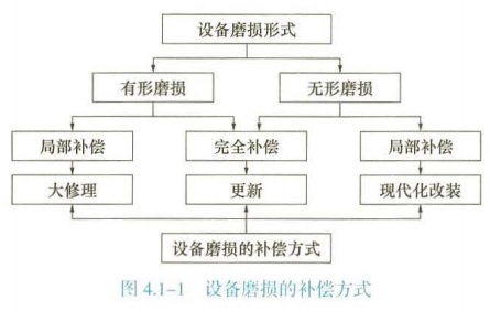 设备有形磨损的局部补偿是大修理,设备无形磨损的局部补偿是现代化改装。设备有形磨损和无形磨损的完全补偿是更新。设备磨损的补偿方式如下图所示