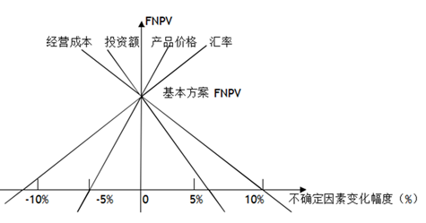 1、对某技术方案的财务净现值(FNPV)进行单因素敏感性分析,投资额、产品价格、经营成本以及汇率四个因素的敏感性分析如下图所示,则对财务净现值指标来说最敏感的因素是( )。
