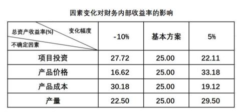 2、某建设项目选定项目投资、产品价格、产品成本和产量四个不确定性因素,各按+5%和-10%的变化幅度分析其对项目总投资收益率的影响,分析数据见下表。