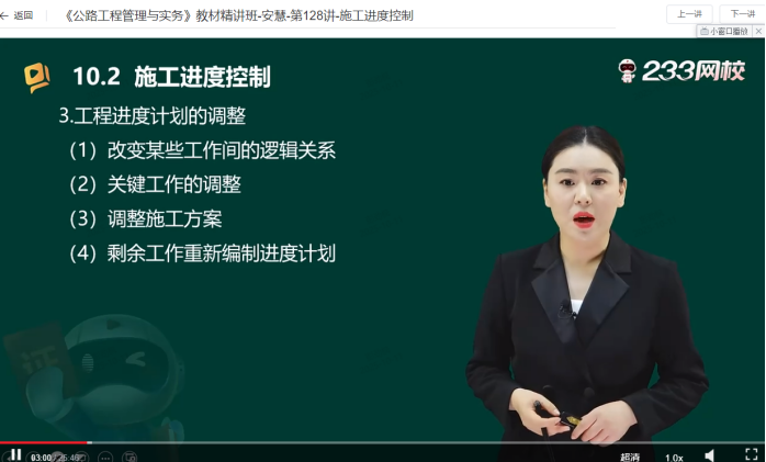 进度计划的调整:(1)改变某些工作间的逻辑关系;(2)关键工作的调整;(3)调整施工方案;(4)剩余工作重新编制进度计划
