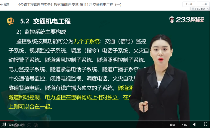 监控系统按其功能可分为九个子系统:交通(信号)监控子系统、视频监控子系统、调度(指令)电话子系统、火灾自动报警子系统、隧道通风控制子系统、隧道照明控制子系统、电力监控子系统、隧道紧急电话子系统、隧道广播子系统