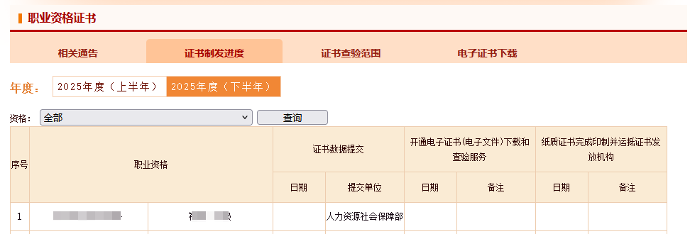 全科成绩合格考生可在中国人事考试网查询2025年一级建造师资格证书办理进度,位置:中国人事考试网“资格证书”栏目,点击“证书办理进度”查看证书的制作进度。