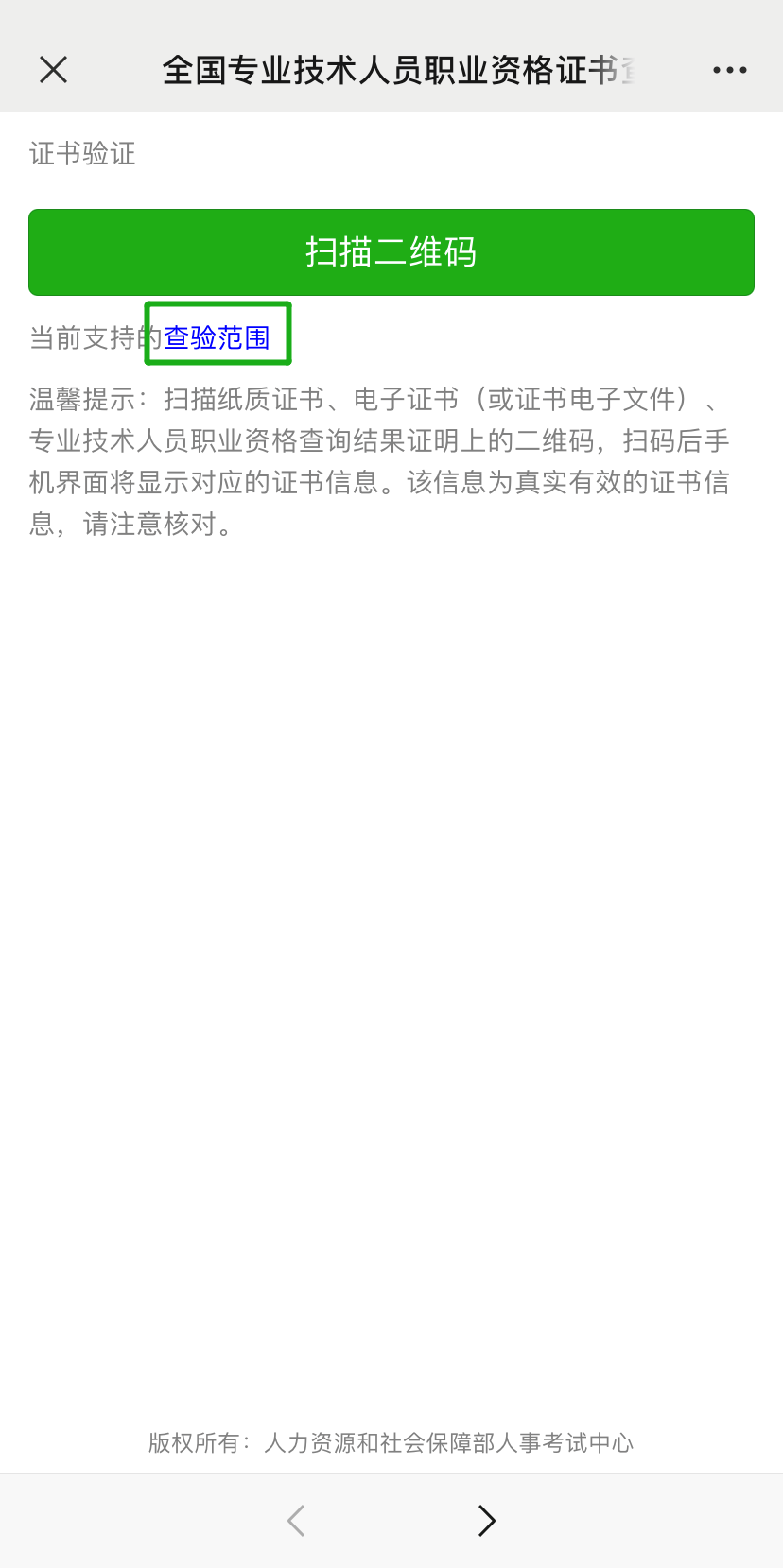 通过手机微信公众号扫描纸质证书、电子证书(或证书电子文件)、专业技术人员职业资格查询结果证明上的二维码,可验证证书信息。
