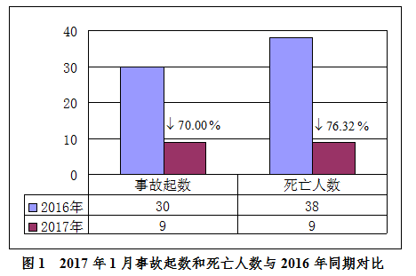 2017年1月,全国共发生房屋市政工程生产安全事故9起、死亡9人,比2016年同期事故起数减少21起、死亡人数减少29人,同比分别下降70.00%和76.32%(见图1)。