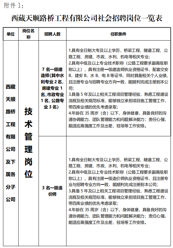 本次面向社会公开招聘10个岗位,共10人。招聘岗位职责及任职条件详见附件1《西藏天顺路桥工程有限公司社会招聘岗位一览表》。