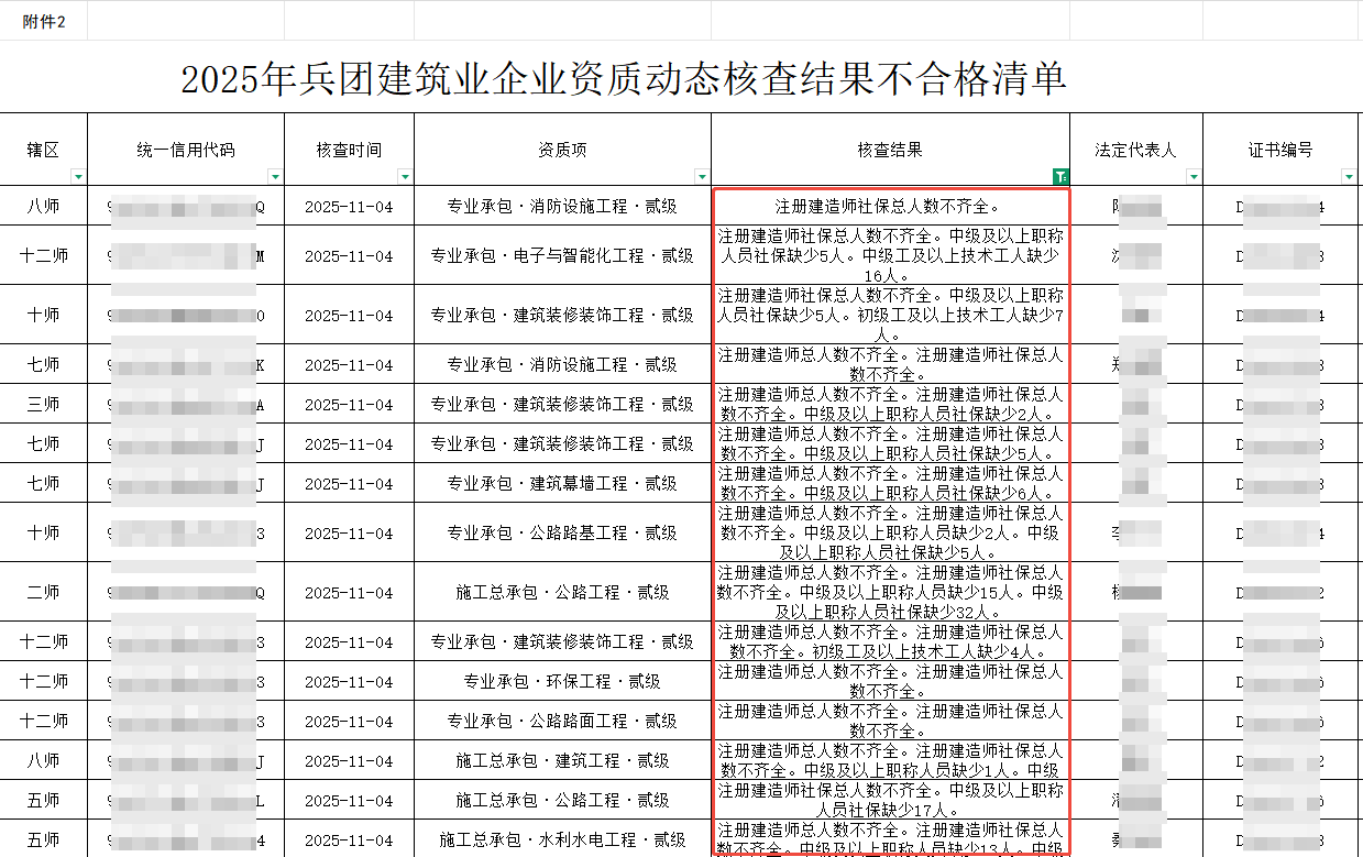 近日,兵团住房和城乡建设局发布了《关于公布2025年度兵团建筑业企业资质动态核查结果的通知》,内容强调:我局对兵团现有建筑业企业资质开展动态核查,共核查企业资质2125项,核查结果合格1250项,不合格875项。其中,不合格的企业资质里面有67.2%的核查结果为“注册建造师总人数不齐”!