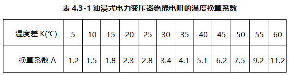 ②绝缘电阻值不应低于产品出厂试验值的70%或不低于10000MΩ(20℃) 。 当施工现场测量温度与产品出厂试验温度不同时,应换算到同一温度时的数值进行比较,油 浸式电力变压器绝缘电阻的温度换算系数见表4.3-1。
