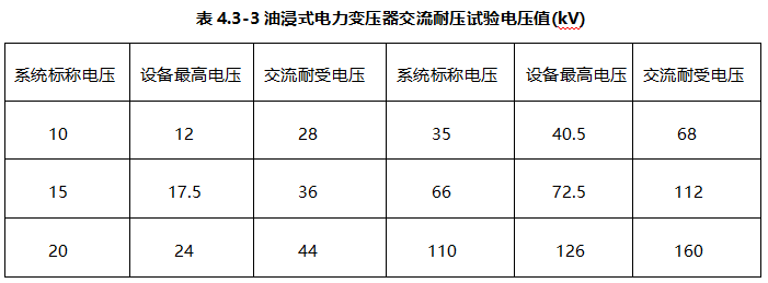 ②额定电压在110kV及以下的油浸式电力变压器,交流耐压试验电压应按表4.3-3 实施 。