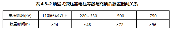 ①油浸式变压器的绝缘试验应在充满合格油,静置一定时间,待气泡消除后方可 进行。油浸式变压器电压等级与充油后静置时间关系应按表4.3-2确定。