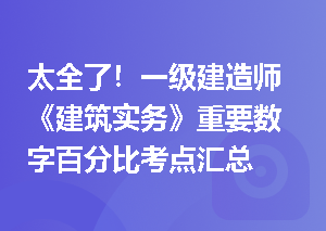 在一级建造师《建筑实务》中,有不少关于百分比的知识点,复习的时候特别容易混淆,唯一的办法就是多看多背,加深印象。233网校特为考生们整理归纳了一建《建筑实务》教材中从 0%~100% 的重要百分比考点,以方便考生们复习,记得添加收藏,千万不要错过了~1、混凝土或抹灰基层涂刷溶剂型涂料时,含水率不得大于8%;涂刷乳液型涂料时,含水率不得大于10%。木材基层的含水率不得大于12%。2、有较高要求的抗震结构适用的钢筋应满足以下要求:(1)实测抗拉强度与实测屈服强度之比不小于1.25(强屈比≥1.25)查看更多>
