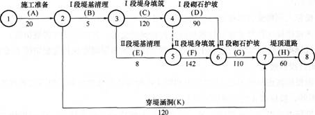 事件5:第225天末检查时,“Ⅱ段砌石护坡”(G工作)已累计完成40%工程量,“I段堤身填筑”(C工作)已累计完成40%工程量,“穿堤涵洞”(K工作)已累计完成60%工程量。