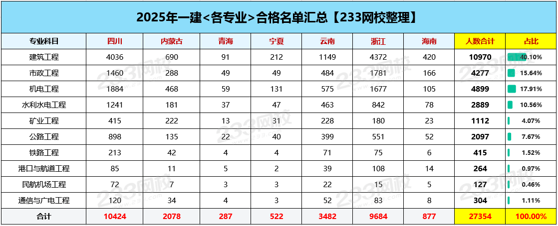 2025年一级建造师考试合格名单的公布,犹如一颗重磅炸弹在建筑行业炸开!经233网校一建学霸君(微信号ks233wx7)整理统计,四川、内蒙古、青海、宁夏、云南、浙江、海南七大省份总合格人数突破2.7万人(较24年上涨28.38%),其中建筑工程专业以10970人通过的绝对优势稳居榜首,成为当之无愧的“王牌专业”!