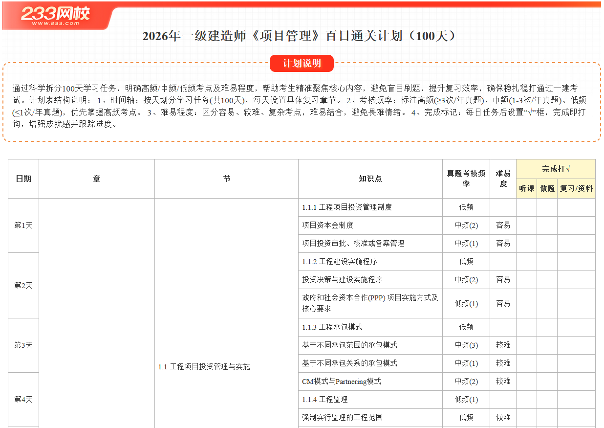 备考一建,时间紧、任务重是常态。盲目刷题、死记硬背不仅效率低下,还容易陷入“学了就忘”的怪圈。而这份计划以“科学拆分、精准聚焦”为核心,将100天的学习任务细化到每一天,帮你告别无效努力,直击考试命脉!