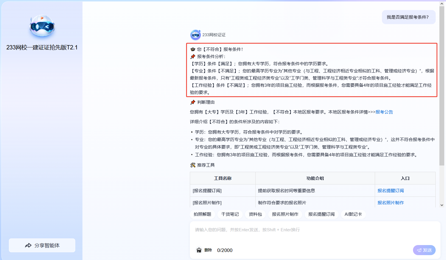 → AI即刻分析,明确告知是否能报考,工作年限要求、专业要求、学习要求等。
