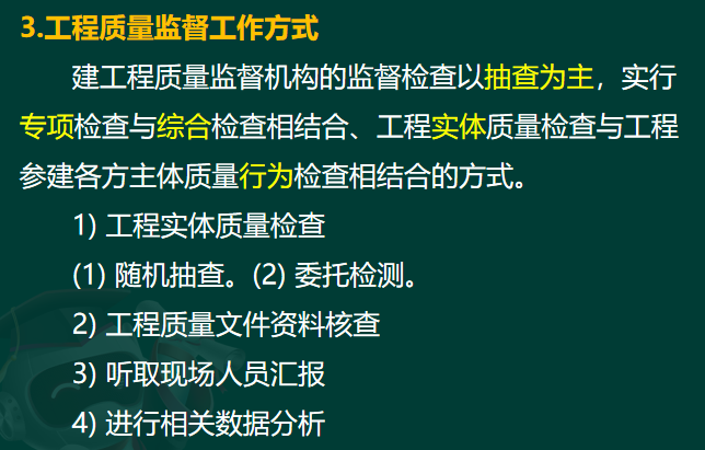 工程质量监督机构的监督检查以抽查为主,实行专项检查与综合检查相结合、工程实体质量检查与工程参建各方主体质量行为检查相结合的方式。