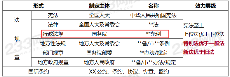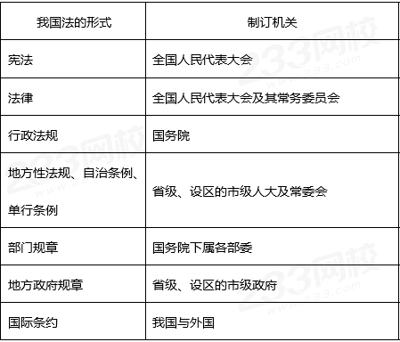 1、我国法的7形式:宪法、法律、行政法规、部门规章、地方性法规/自治条例和单行条例、地方政府规章、国际条约(我国缔结、承认等)。