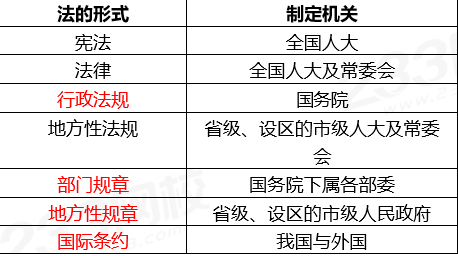 1、我国法的7形式:宪法、法律、行政法规、部门规章、地方性法规/自治条例和单行条例、地方政府规章、国际条约(我国缔结、承认等)。