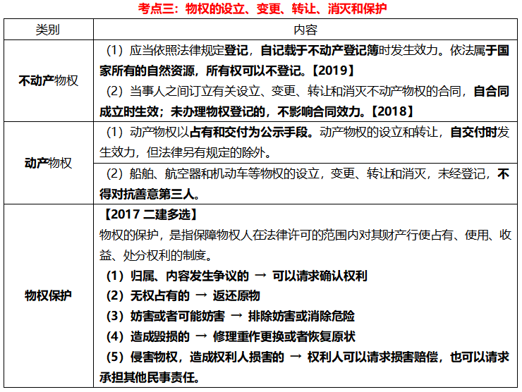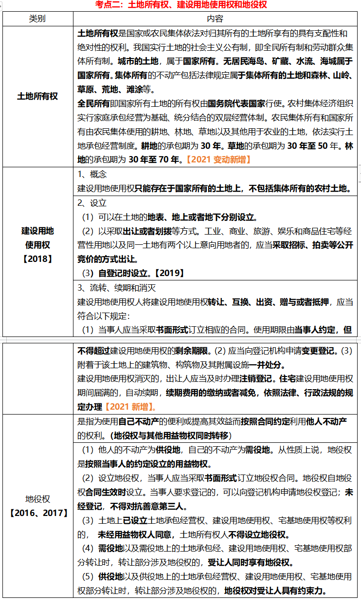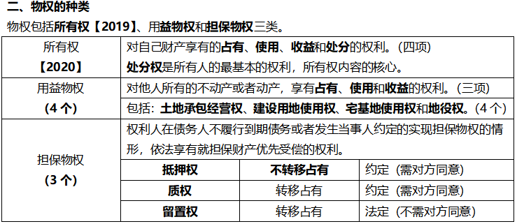 2、用益物权:土地承包经营权、建设用地使用权、居住权、宅基地使用权和地役权