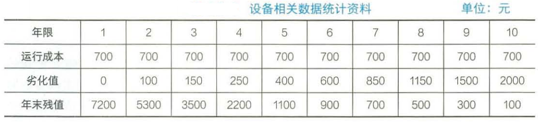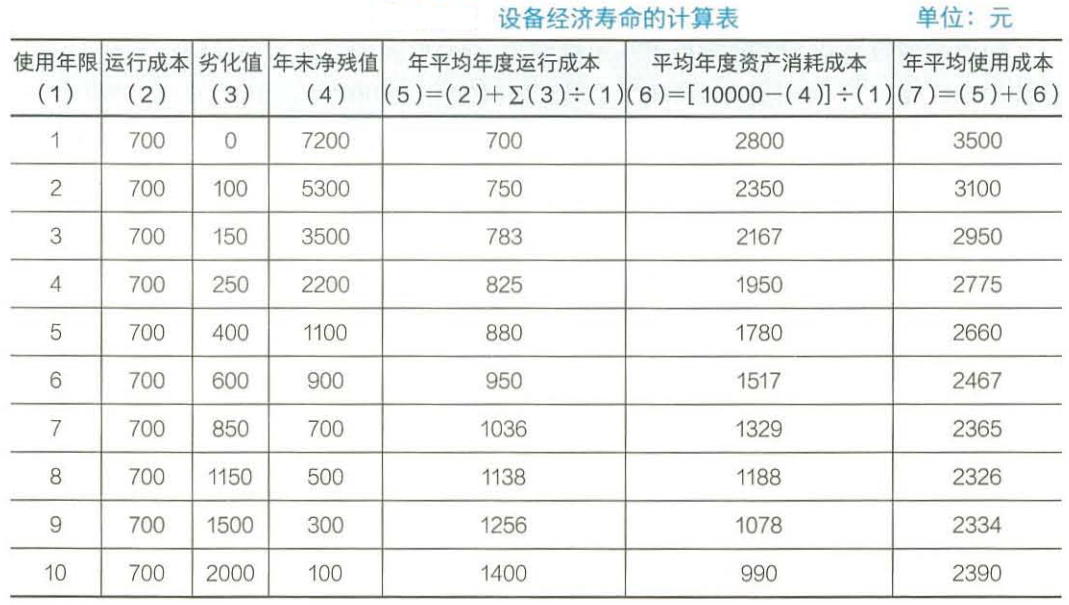 从上表可知,第8年设备的年平均使用成本为2326元,在自然寿命期内最小,所以该设备的经济寿命为8年。
