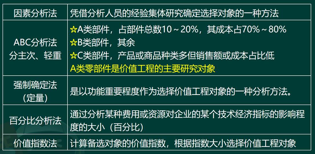 ③强制确定法。以功能重要程度作为选择价值工程对象的一种分析方法。该方法适用于从产品或其组成部分的性能、效用维度选择价值工程对象