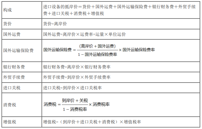答察解析: 进口设备抵岸价=货价(离岸价)+国外运费+国外运输保险费+银行财务费+外贸手续费+进口关税+增值税+消费税;