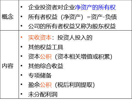 3.所有者权益:指企业投资者对企业净资产的所有权,是企业资产扣除负债后由所有者享有的剩余权益。包括:实收资本(或股本);其他权益工具;资本公积;其他综合收益;专项储备;盈余公积;未分配利润