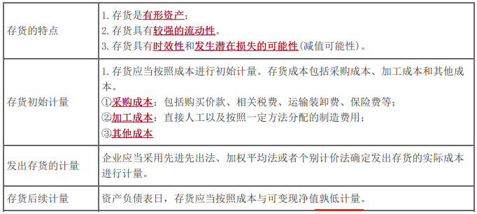 (1)存货初始计量:存货应当按照成本(采购成本、加工成本和其他成本)进行初始计量