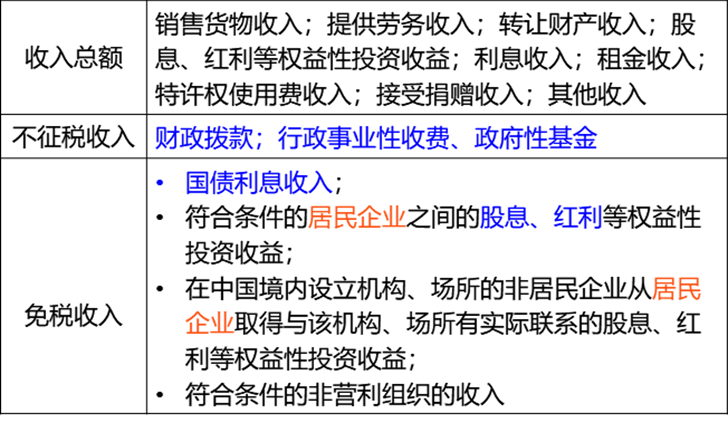 1.收入总额:销售货物收入,提供劳务收入,转让财产收入,股息、红利等权益性投资收益,利息收入,租金收入,特许权使用费收入,接受捐赠收入,其他收入