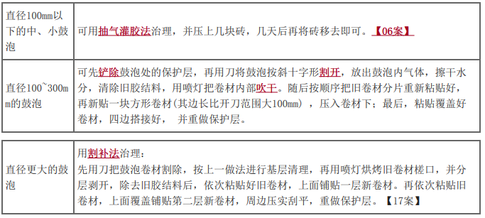 a. 切割法:对于天沟卷材耸肩脱空等部位,可先清除保护层,切开将要脱空的卷材,刮除卷材底下积存的旧胶结料,待内部冷凝水晒干后,将下部已脱开的卷材用胶结料粘贴好,加铺一层卷材,再将上部卷材盖上。