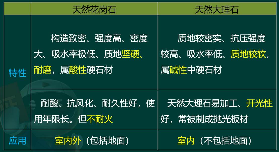 花岗石构造致密、强度高、密度大、吸水率极低、质地坚硬、耐磨,为酸性硬石材。其耐酸、抗风化、耐久性好,使用年限长,但不耐火。花岗石板材主要应用于大型公共建筑或装饰等级要求较高的室内外装饰工程,主要用于室内外的地面、墙面、柱面、台面、台阶等。