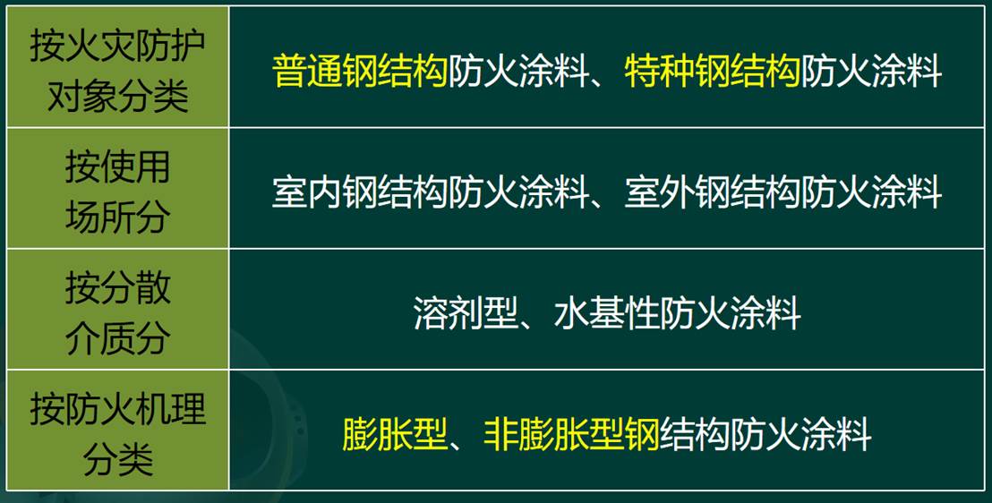 (1)按火灾防护对象分类:普通钢结构防火涂料、特种钢结构防火涂料。