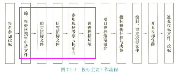 (2)工程总承包投标主要工作流程:准备资格预审文件→研究招标文件→决定投标方案→选定分包商→确定主要采购计划→参加现场勘察与标前会议→编写标书→审定标书→办理投标保函/保证金→呈递标书→参加开标。