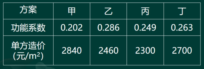 V丙=0.249/0.223=1.117,V丁=0.263/0.262=1.004;显然,乙方案的价值系数最大,为最优方案。