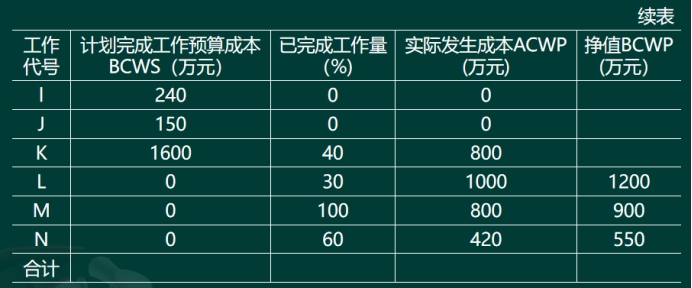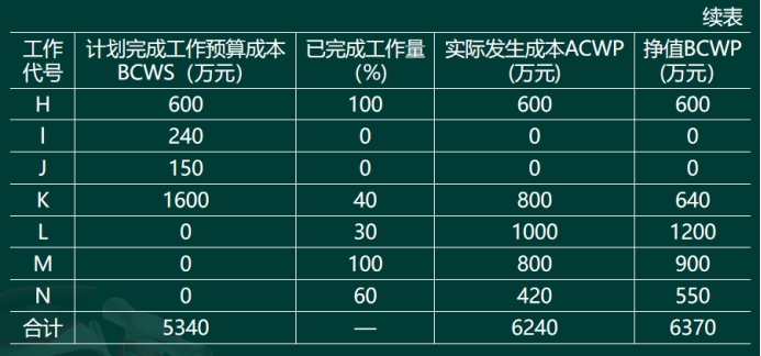 (1)三个成本值①已完成工作预算成本(BCWP)=已完成工程量×预算成本单价