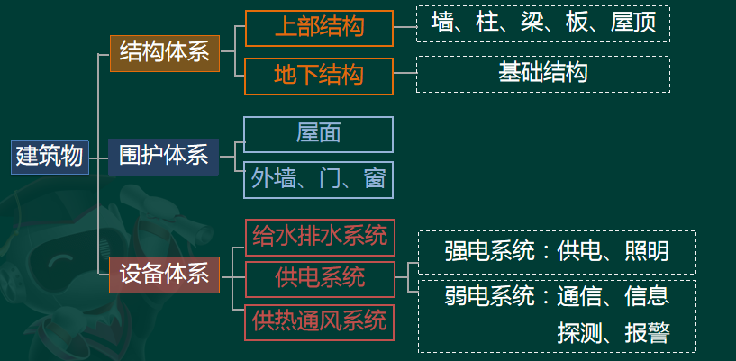 注:这里注意与屋盖的区分。结构体系:一般将其分为上部结构和地下结构:上部结构是指基础以上部分的建筑结构,包括墙、柱、梁、板、屋盖等;地下结构指建筑物的基础结构。
